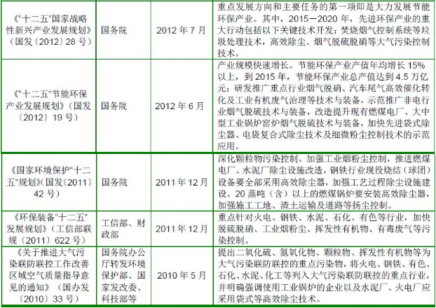 針對大氣污染防治,環境保護主管部門以《中華人民共和國大氣污染防治法》為依托,不斷修訂了《水泥工業大氣污染物排放標準》(GB 4915-2013)、《水泥窯協同處置固體廢物污染控制標準》(GB 30485-2013)、《火電廠大氣污染物排放標準》(GB13223-2011)、《環境空氣質量標準》(GB 3095-2012)、《鋼鐵燒結、球團工業大氣污染物排放標準》(GB 28662-2012)、《煉鋼工業大氣污染物排放標準》(GB 28664-2012)、《煉焦化學工業污染物排放標準》(GB6171-2012 代替 GB16171-1996)以及《鉛、鋅工業污染物排放標準》等6項有色金屬行業排放標準修改單等,對重污染行業空氣污染物排放設置了更為嚴格的排放控制標準。