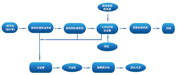 ILMS工藝是以ILMS高效生物反應器為核心處理單元,通過前端高效物化預處理和尾端深度凈化實現垃圾中轉站壓濾液的達標排放,該工藝流程圖如下: